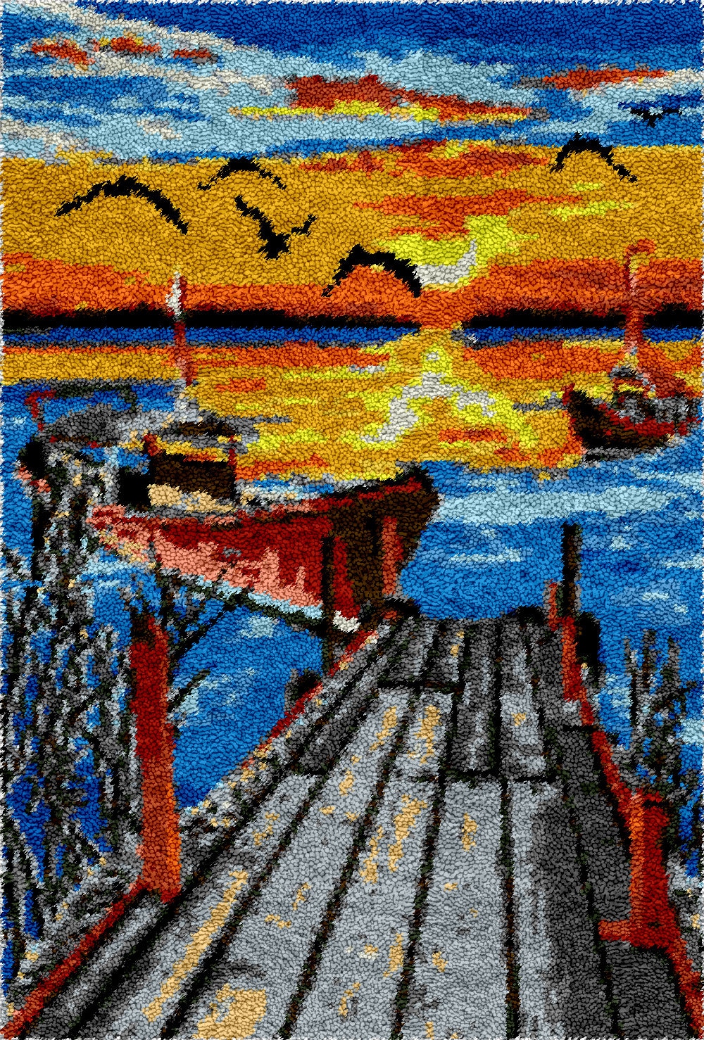 This Dock Sunset Rug Making Latch Hooking Kit will give you a rug that is wonderfully lush. This rug is easy to fit any decor and the possibilities are astounding. You can use this rug on the floor, wall, sofa, bed or window.