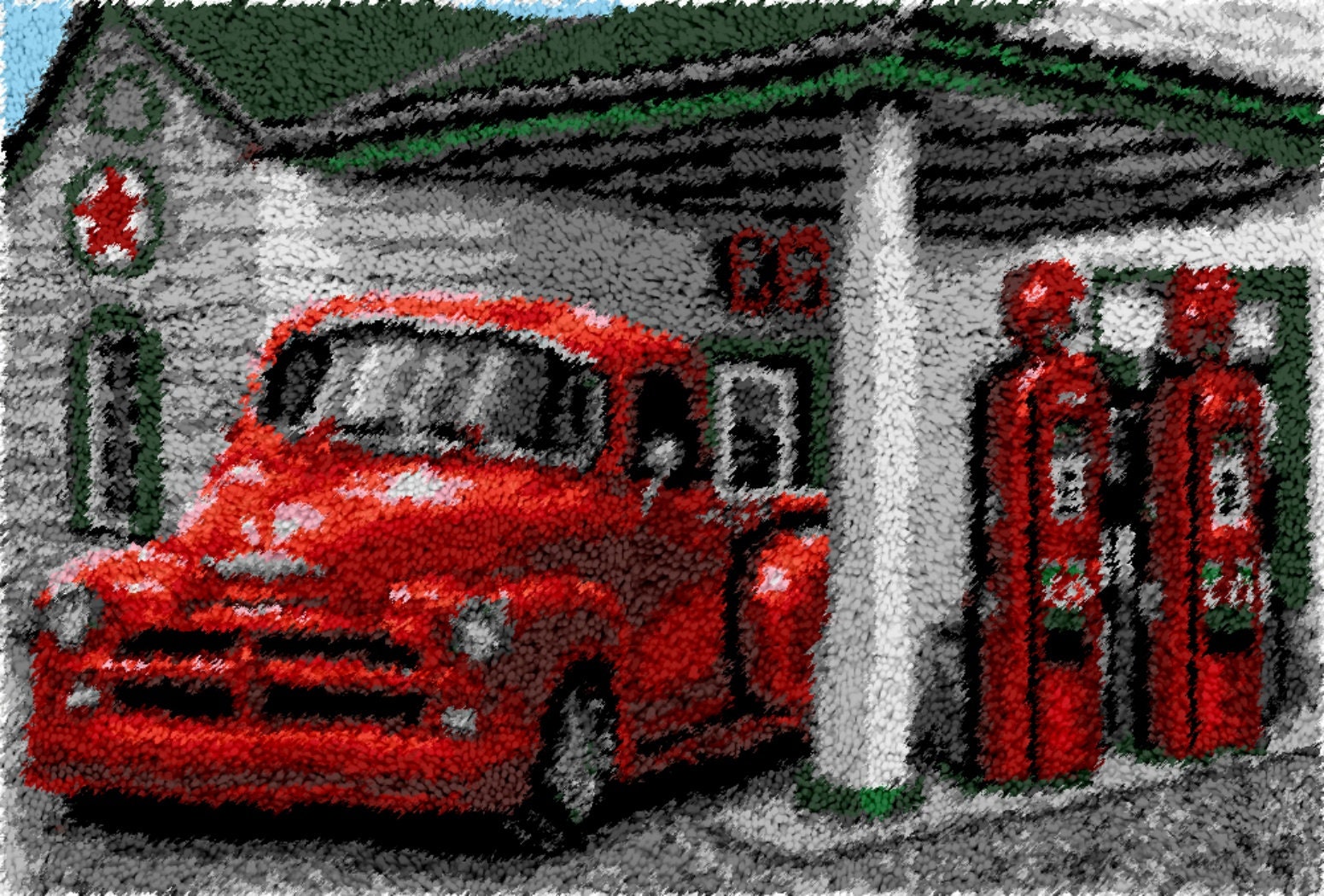 This Vintage Gas Station Rug Making Latch Hooking Kit will give you a rug that is wonderfully lush. This rug is easy to fit any decor and the possibilities are astounding. You can use this rug on the floor, wall, sofa, bed or window.