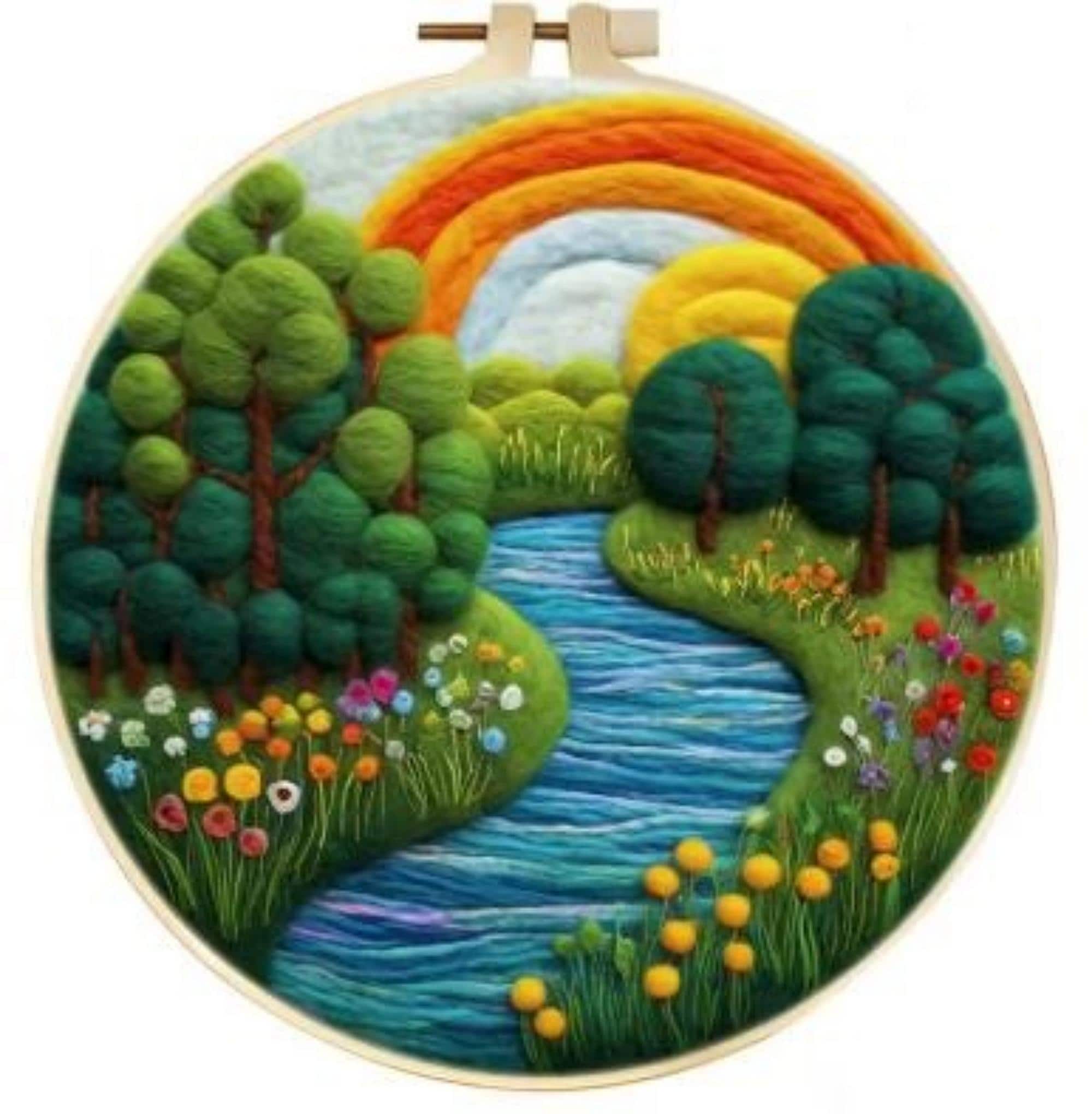This Needle Wool Felting Kit for Beginners | River Rainbow is a DIY kit, you need to do your own 20 cm embroidery. Printed fabric, the pattern has been printed on the canvas, so the canvas cannot touch the water before the embroidery is completed, otherwise the printed part will disappear. Upon completion, put the fabric into the water for half an hour, let it dry, and then you can make a frame for it. You can hang it in the living room, study, kitchen, bedroom, etc. Frame is included.